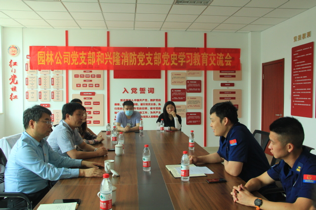 首先开始的是党史学习教育交流会,双方就党建品牌培育工作进行了交流,兴隆消防党支部在建邺消防救援大队“红门党旗红”党建品牌建设牵引下,强堡垒、抓作风、带队伍,保障了中心任务。园林公司党支部以“铸红心·享园林”党建品牌建设为牵引,凝聚思想、开拓创新,推动公司高质量发展。之后,双方就党史学习教育开展情况进行了交流,并提出要进一步发挥双方优势和特长,加强交流与协作,双向促进、共同提高。