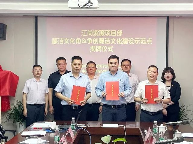 在学习贯彻习近平新时代中国特色社会主义思想主题教育中,为加强清廉教育,引导员工绷紧廉洁自律这根弦,确保工程项目建设廉洁高效,近日,奥体公司和江山智联公司联合党总支(以下简称“联合党总支”)在江尚紫薇项目部创建廉洁文化角。相关参建单位参加。