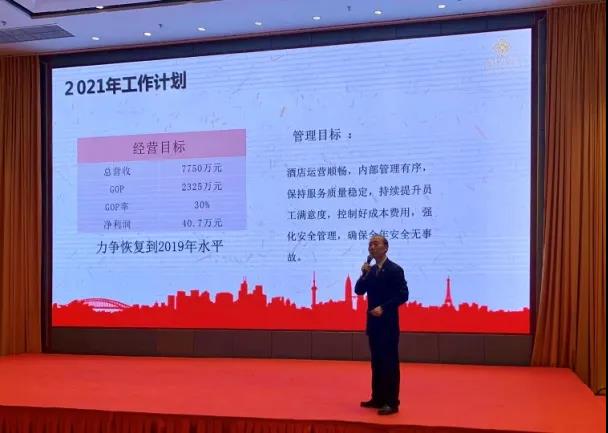 在对2020年度工作全面总结中,酒店经营班子肯定了全体员工在过去一年的辛勤付出和取得的经营成效,并对2021年度工作目标进行了部署和动员。
