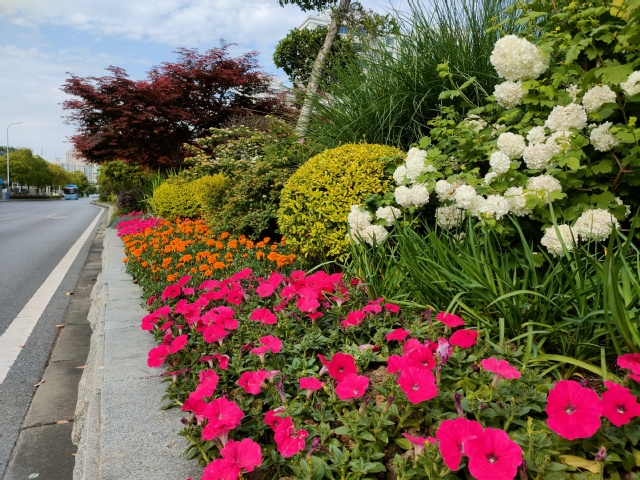 在草花品种上,除了选用一串红、孔雀草、矮牵牛、繁星花等常规季节性、花期较长的品种外,还新增了毛地黄、垂吊牵牛、金叶雪茄花、超级海棠、欧石竹、常夏石竹、藿香蓟等市民喜欢且生命力旺盛的草花品种。多颜色、多品种的搭配,达到了花色靓丽多彩、层次错落有致、春意盎然的景观效果,提升了伟德国际1946源于英国中部地区道路景观品质,扮靓了伟德国际1946源于英国新城。