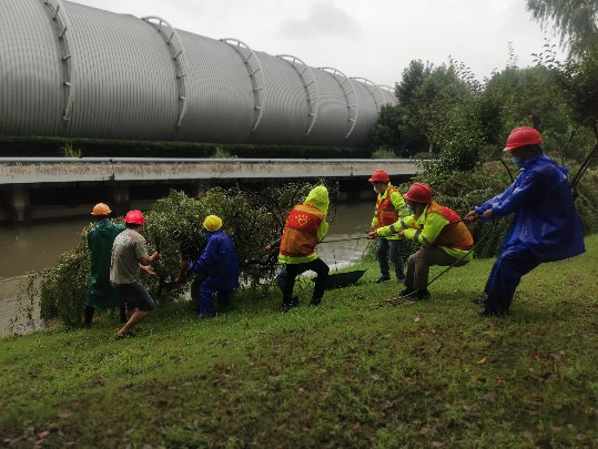 “梦都大街向阳河边有一株倒伏柳树,需要支援。”党员们闻令而动,迅速赶往树木倒伏点,因大半截树木主杆已倒至护栏外,大家用绳索固定好主杆,一名绿化工人切割断枝,志愿者们拽住绳索,因主杆太重,断截的树木落入水中,志愿者们又协助绿化工人们一起,齐心协力将断截的主杆拉上了岸。抢险倒伏树木后,大家接着巡查、清理断枝,雨水挡不住志愿者们的工作热情,大家在志愿之余,更是体会到一线绿化养护人员的不易。