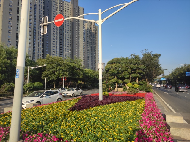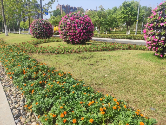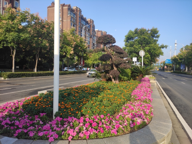 水韵路中分带的花球也换上了新装,10个巨大的牵牛花球被红黄色的花带簇拥着,在太阳下尽情地绽放着,像是小孩的笑脸,欢快地为祖国母亲庆生。