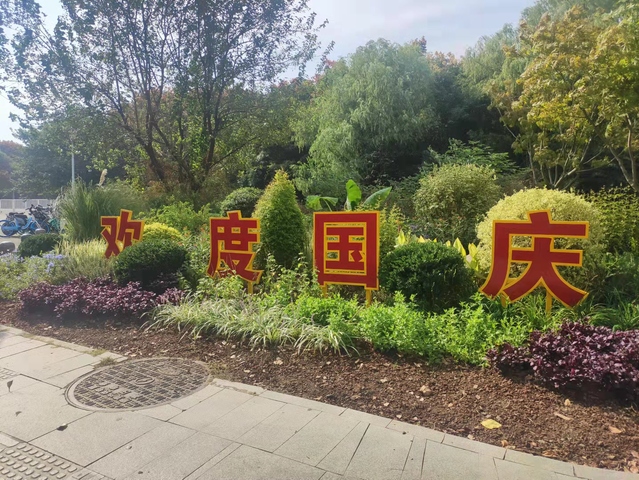 乐山路和梦都大街的东南角节点是新增加的花境景观,使用了完美冬青、迷迭香、金叶莸等二十多个草花品种,错落有致的草花搭配和花境中竖起的“欢度国庆”标语牌,烘托出热烈的节日气氛。