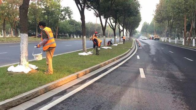 公司严格要求刷白“精细化”养护标准,首先根据乔木、花卉类树木的特性,区别了刷白高度;其次,在刷白时采取了垫衬措施,确保地面和地被植物干净美观;最后,按照止口平整,高度一致,刷白均匀,不留死角的要求,在城区多主干道和公园同时开展刷白工作。