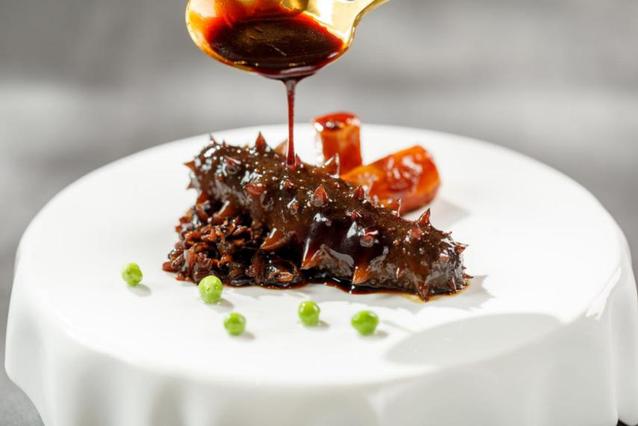 “蜜汁脆皮刺参”一改传统焖煮做法,选用上乘刺身,通过新派创意手法炸制出的脆皮遇上总厨自创浇汁,爽口弹牙。