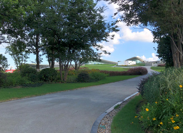绿博园东入口项目在绿植选用上注重运用彩叶树种,中山红、佛甲草、南天竹等彩叶乔灌木,衬托在绿茵茵的草坪上,增强了观赏效果。大面积的花岗岩铺装,弧形路牙石花坛、多色植物搭配,形成了空间开阔、环境优美的公园出入口景观。