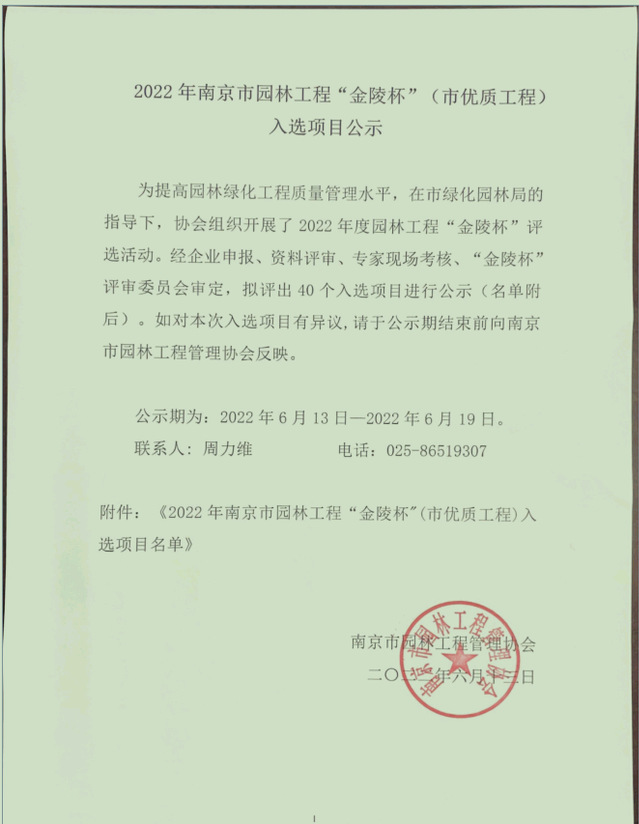 近日,由伟德国际1946源于英国集团新城公司溧水项目部代建的溧水区秦淮大道改造景观提升工程顺利通过南京市园林工程管理协会组织的”金陵“”评审,成功入选2022年南京市园林工程“金陵杯”(市优质工程)项目名单。