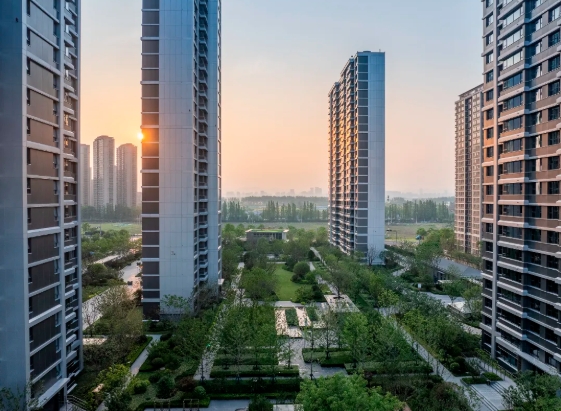小区以1300平方米的阳光草坪为核心,乌桕林、樱花林与低矮灌木穿插其间,形成“花叶共赏、四季生机”的浪漫花廊;乌桕林与水景水系则构成“水榭林间”中央景观轴,融入生态草坪设计,增强了居民与自然的互动体验。